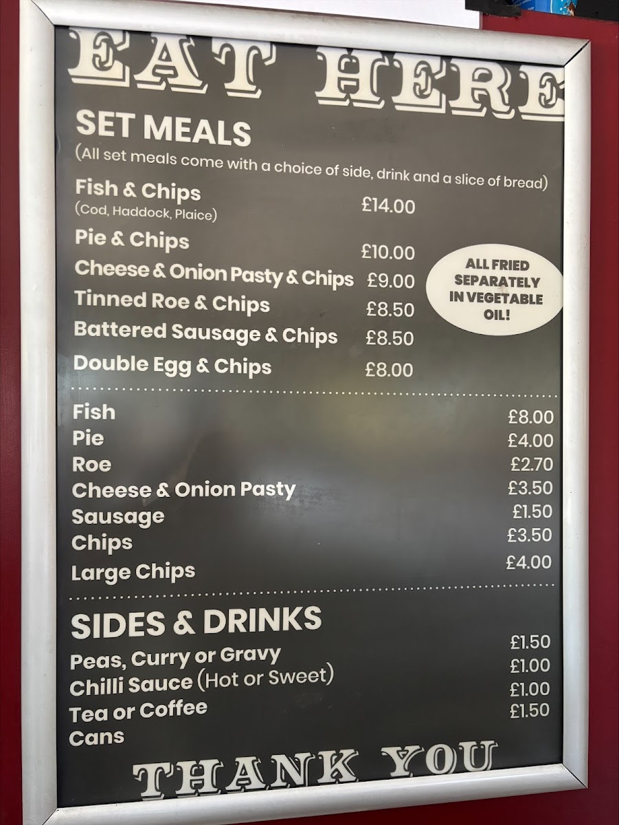 Highlights include traditional options like battered cod served alongside golden chips and mushy peas, as well as simple but hearty choices such as pies and cheese & onion pasties with chips. For a little extra flavor, you can add sauces like curry or chilli, complementing the main dishes without overwhelming them.